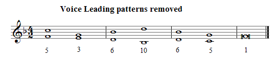 In this kind of counterpoint, one part moves whilst another voice stays on the same note. Note: bar 3 breaks this pattern in order to make a better cadence (see fourth species later). Each of the notes of the slower moving part (in semibreves) starts in consonance with the other part. As the faster moving part moves between one consonance and another, this produces two possible types of voice leading pattern which elaborate the underlying movement. These are the arpeggio and the passing note. The arpeggio notes are indicated by "Arp" in the example. They result from movement from one consonant interval to another consonant interval. Arpeggio literally means "in the style of a harp" i.e. the notes of a chord played successively rather than concurrently. Whilst in 16th century polyphony, the horizontal voice leading is more important than the underlying chords, arpeggiation is important in analysis of later music where it opens up the possibility of elaborating underlying chords by parts moving from one note of a chord to another note of the same chord. In 16th century polyphony, this can alternatively be described as a "consonant skip" if we don't want to refer to chords. An alternative for the moving part is to move by step onto a dissonant interval whilst the stationary part retains its original note. The movement must be completed by step in the same direction and on to a consonant note in order to return to normal consonant writing. This kind of discord is referred to as a passing note as it is created by a note passing between consonances. It fills the gap between two consonant notes a third apart. These are indicated by "P" in the example above. The passing note normally occurs on the weak beat and the consonance on the stronger beat. This creates an important way of deploying dissonant intervals, creates variety and results in an important kind of voice leading pattern which is very common in this period and in later periods of music. (In less frequent situations, the passing note dissonance can occur on the strong beat. This is normally referred to as an "accented passing note" but this is beyond the scope of this overview) In this example, the passing notes produce dissonant intervals of a 7th and a 9th. It is possible to have similar examples for dissonant intervals of a 2nd and 4th (where the 4th is with the bass). These two examples show how voice leading can be used to elaborate underlying patterns. These Arpeggios and passing notes are voice leading elaboration of the underlying consonant one to one movement. If we strip away this surface voice leading we are left with the following underlying one to one consonant movement: